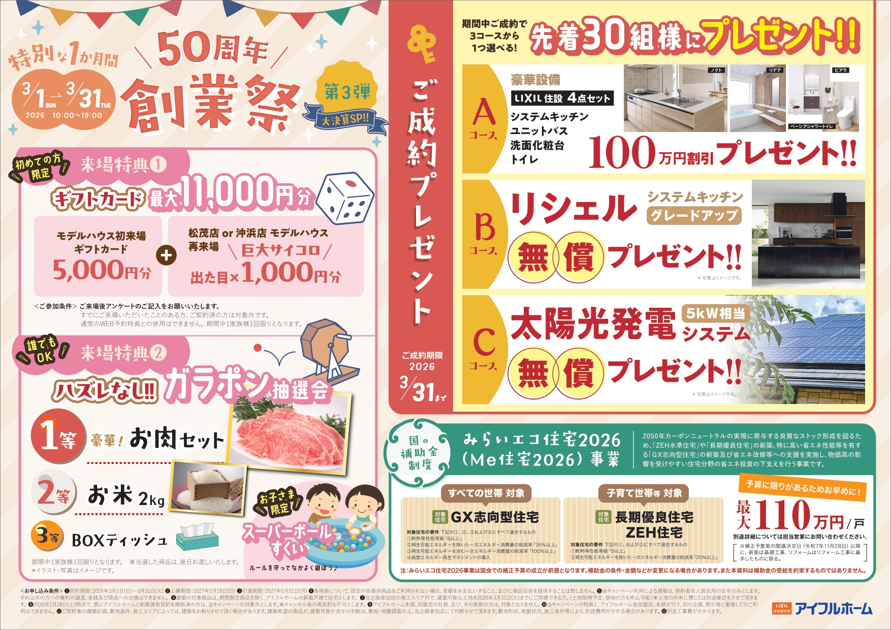 3/1(日)~3/31(火)の期間内に初めてご来場されたお客様が、この期間に再来場していただいた場合に巨大サイコロの出た目×1,000円分のギフトカードをプレゼント! ※4/30(木)までに再来場された方に限ります。